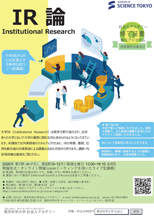大学IR(Institutional Research)は教学分野で遂行され、近年、多くの大学において大学の運営に関わるIRも求められるようになってきています。 本講座では、IR実務者のスキルアップのためにIRの背景、基礎、応用を最先端のIR実務者による講義も含めた内容から学びます。