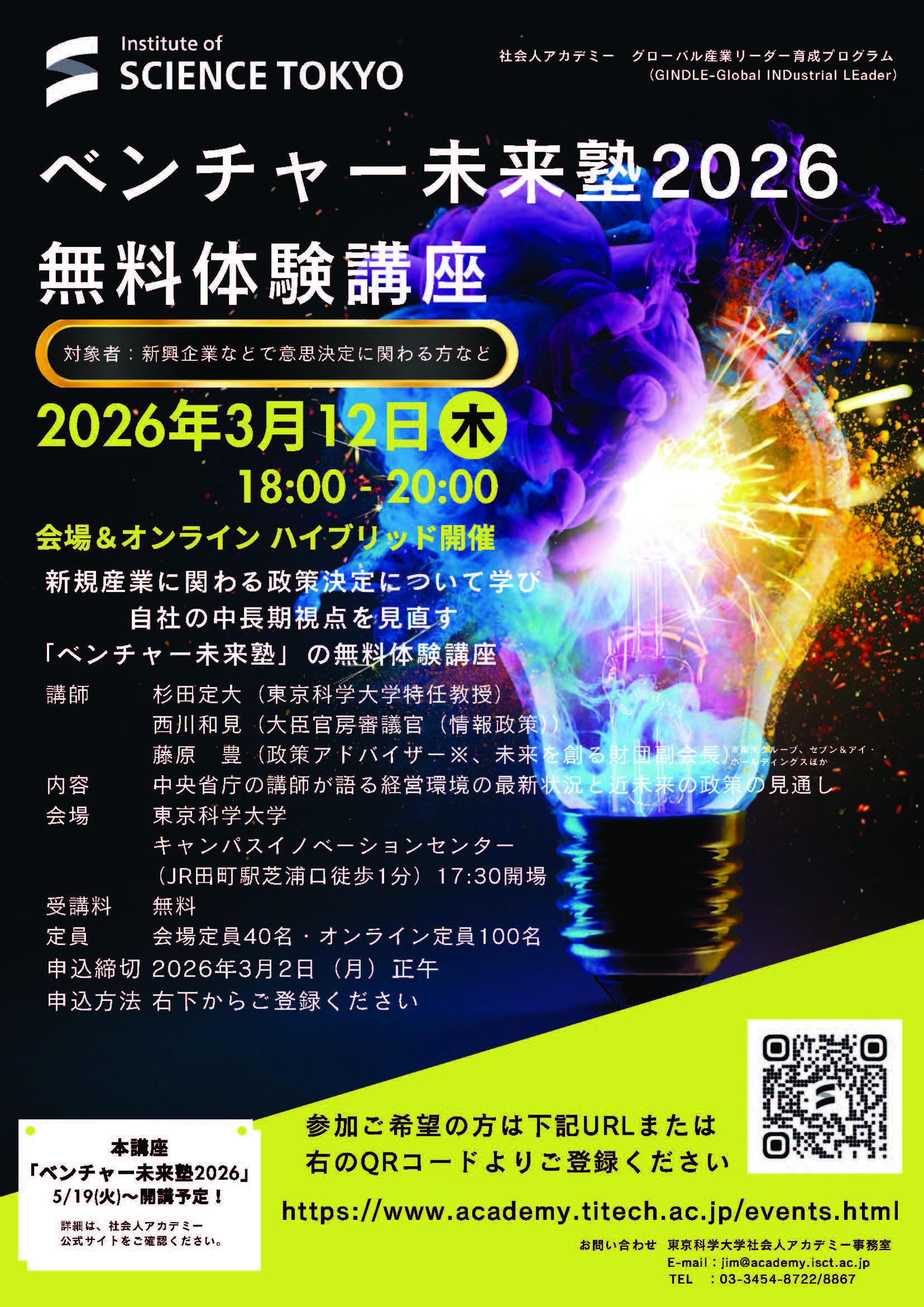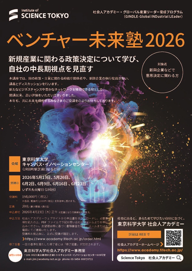 講座にご興味のある方、学びを更新していきたい「ベンチャー未来塾」OBの方もぜひお申込みください。